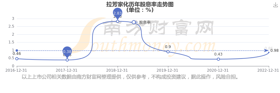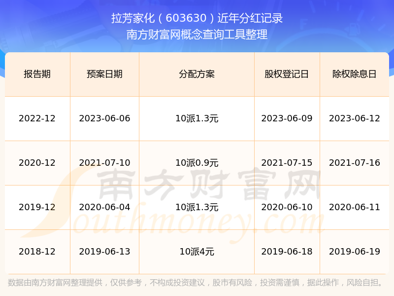 拉芳家化最新一次公布的分紅方案為10派1.3元。本次權(quán)益分派股權(quán)登記日為2023年6月9日,除權(quán)除息日為2023年6月12日,派息日為2023年6月12日。