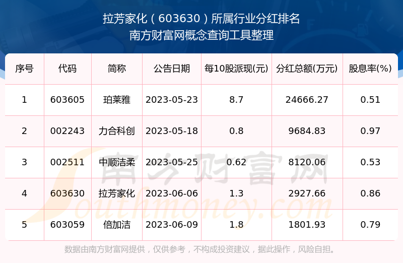 按照南方財富網(wǎng)趨勢選股系統(tǒng)統(tǒng)計,拉芳家化所屬行業(yè)為美容護(hù)理行業(yè),美容護(hù)理行業(yè)分紅排名情況如下表: