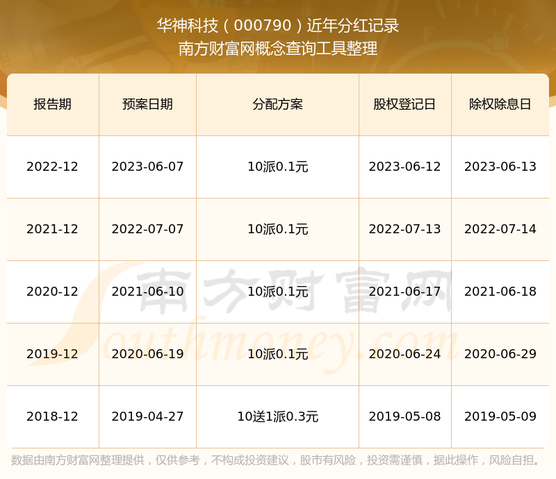 華神科技最新一次公布的分紅方案為10派0.1元。本次權益分派股權登記日為2023年6月12日,除權除息日為2023年6月13日,派息日為2023年6月13日。