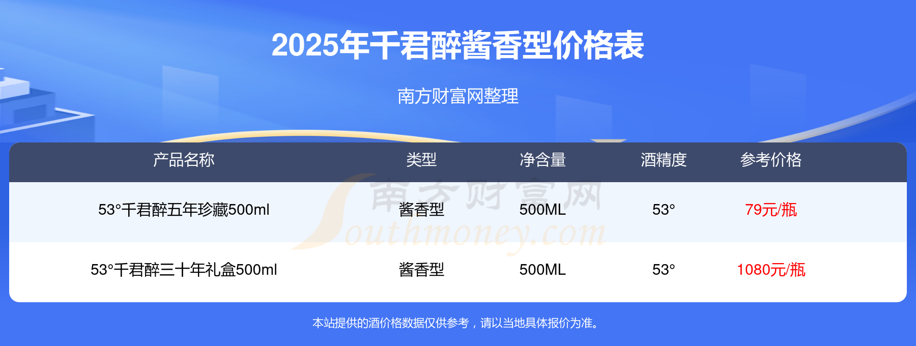 2025年千君醉醬香型酒53°千君醉三十年禮盒500ml、53°千君醉五年珍藏500ml等最新價格如下:
