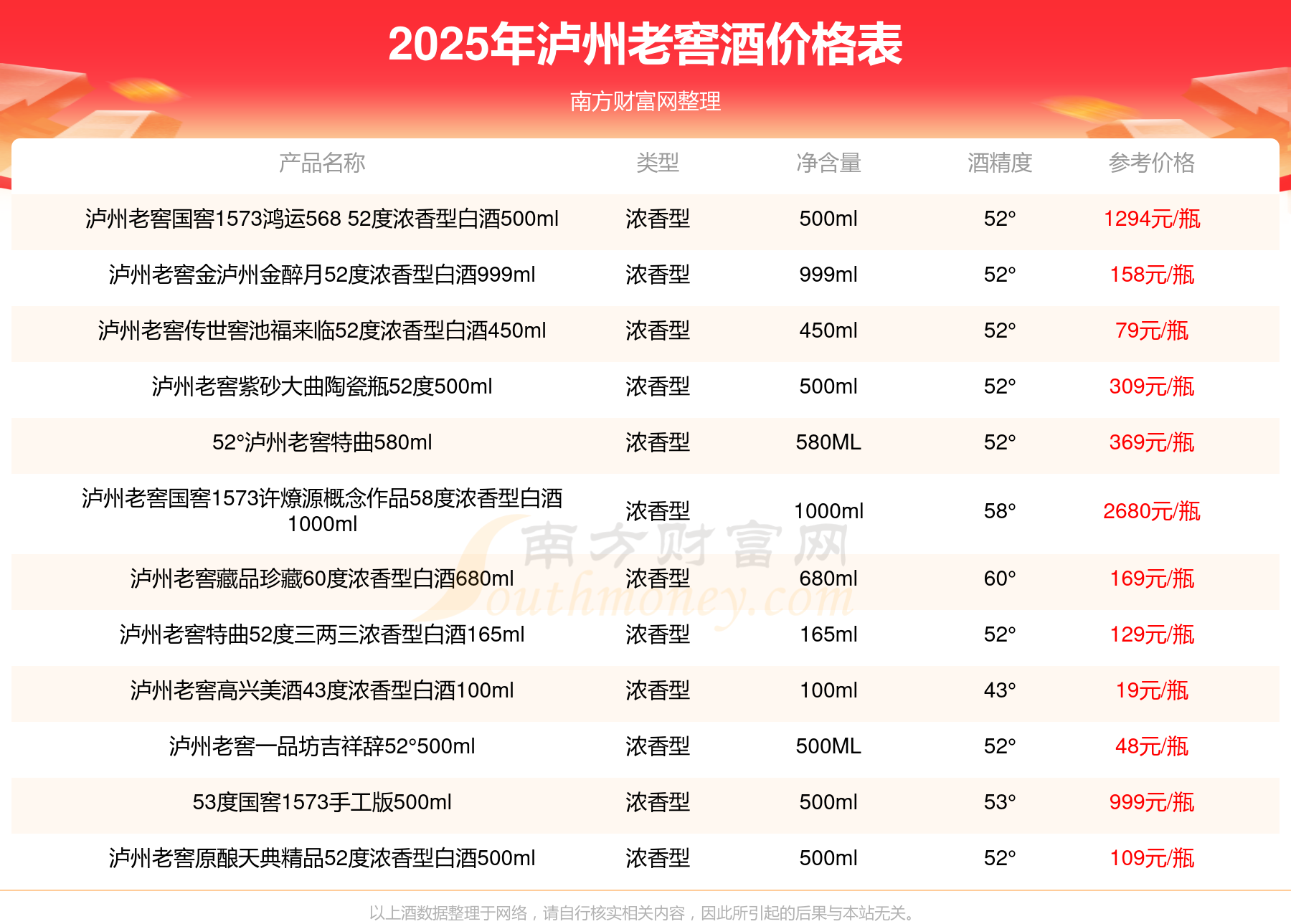 2025瀘州老窖酒最新價格:瀘州老窖國窖1573春釀鼠兆豐年E 55度參考價17999元/瓶、瀘州老窖國窖1573生命中的那壇酒55度014參考價9999元/瓶、瀘州老窖國窖1573春釀鼠兆豐年A 55度參考價5088元/瓶、瀘州老窖國窖1573生命中的那壇酒55度013濃香型白酒1000ml參考價4988元/瓶。