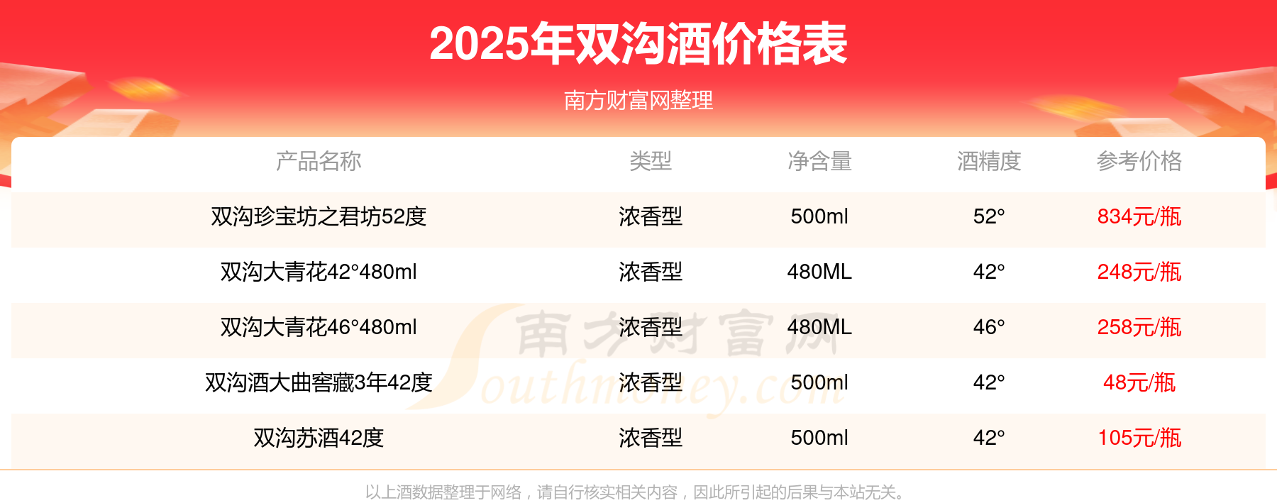 2025年雙溝酒雙溝珍寶坊之君坊52度、雙溝大青花46°480ml、雙溝大青花42°480ml、雙溝蘇酒42度、雙溝酒大曲窖藏3年42度等最新價(jià)格如下: