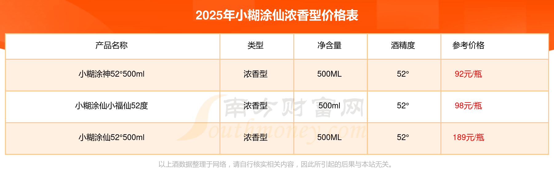 2025年,小糊涂仙52°500ml、小糊涂仙小福仙52度、小糊涂神52°500ml等小糊涂仙濃香型酒價(jià)格如下:小糊涂仙52°500ml參考價(jià)189元/瓶、小糊涂仙小福仙52度參考價(jià)98元/瓶、小糊涂神52°500ml參考價(jià)92元/瓶。