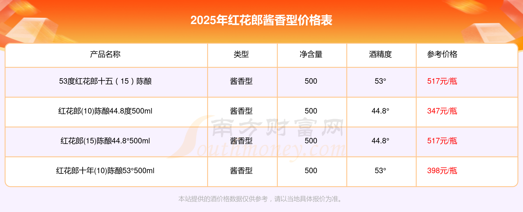 2025年紅花郎醬香型價(jià)格最高的酒是53度紅花郎十五(15)陳釀,參考價(jià)517元/瓶,最低的是紅花郎(10)陳釀44.8度500ml,參考價(jià)347元/瓶,價(jià)格高低差為170元/瓶。