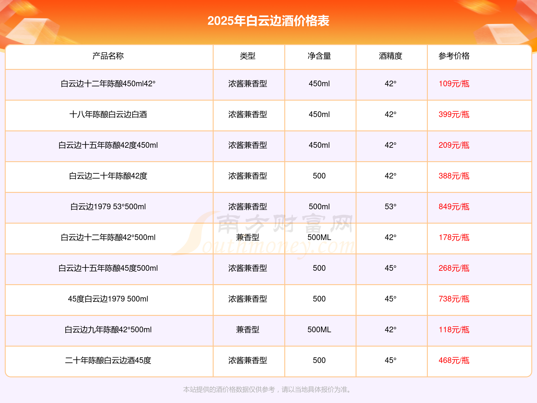 2025年白云邊酒白云邊1979 53°500ml、45度白云邊1979 500ml、二十年陳釀白云邊酒45度等最新價格如下:白云邊1979 53°500ml參考價849元/瓶、45度白云邊1979 500ml參考價738元/瓶、二十年陳釀白云邊酒45度參考價468元/瓶。