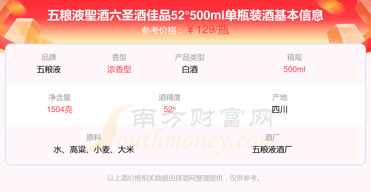 五糧液聖酒六圣酒佳品52°500ml單瓶裝基本信息