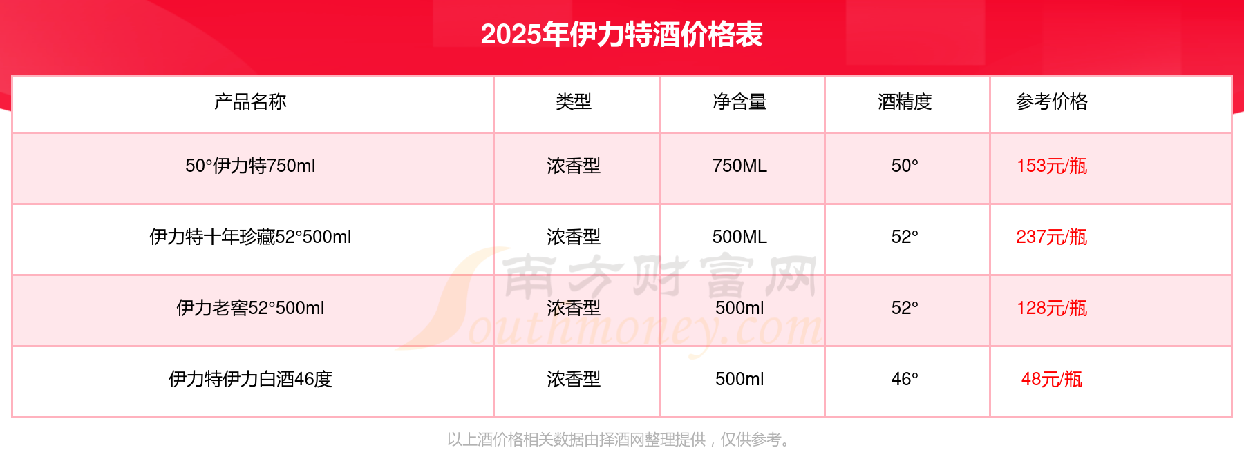 2025年,伊力特十年珍藏52°500ml、50°伊力特750ml、伊力老窖52°500ml、伊力特伊力白酒46度等伊力特酒價格如下:伊力特十年珍藏52°500ml參考價237元/瓶、50°伊力特750ml參考價153元/瓶、伊力老窖52°500ml參考價128元/瓶、伊力特伊力白酒46度參考價48元/瓶。