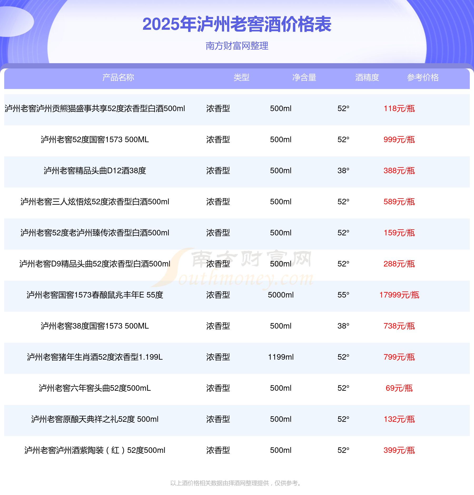 2025年,瀘州老窖國窖1573春釀鼠兆豐年E 55度、瀘州老窖國窖1573生命中的那壇酒55度014、瀘州老窖國窖1573春釀鼠兆豐年A 55度、瀘州老窖國窖1573生命中的那壇酒55度013濃香型白酒1000ml等瀘州老窖酒價格如下: