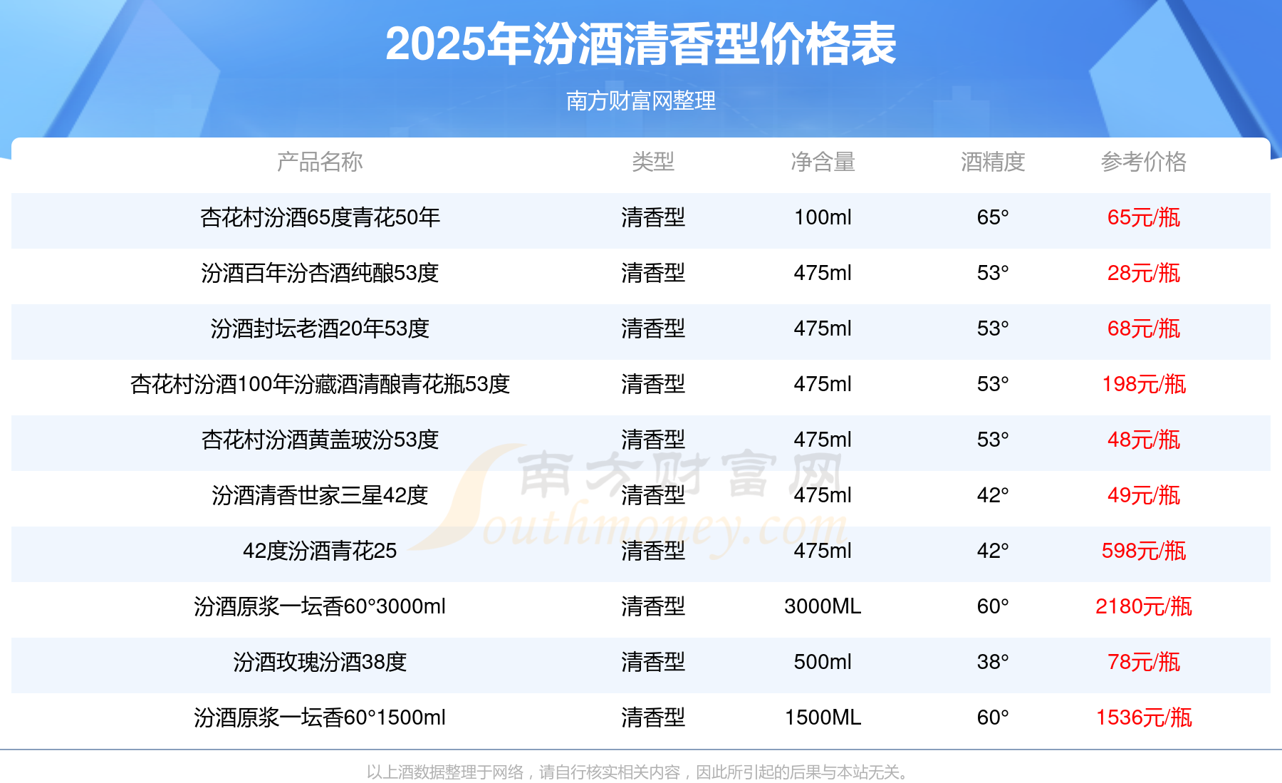 汾酒清香型酒最新價(jià)格2025:汾酒原漿一壇香60°3000ml參考價(jià)2180元/瓶、汾酒原漿一壇香60°1500ml參考價(jià)1536元/瓶、42度汾酒青花25參考價(jià)598元/瓶。