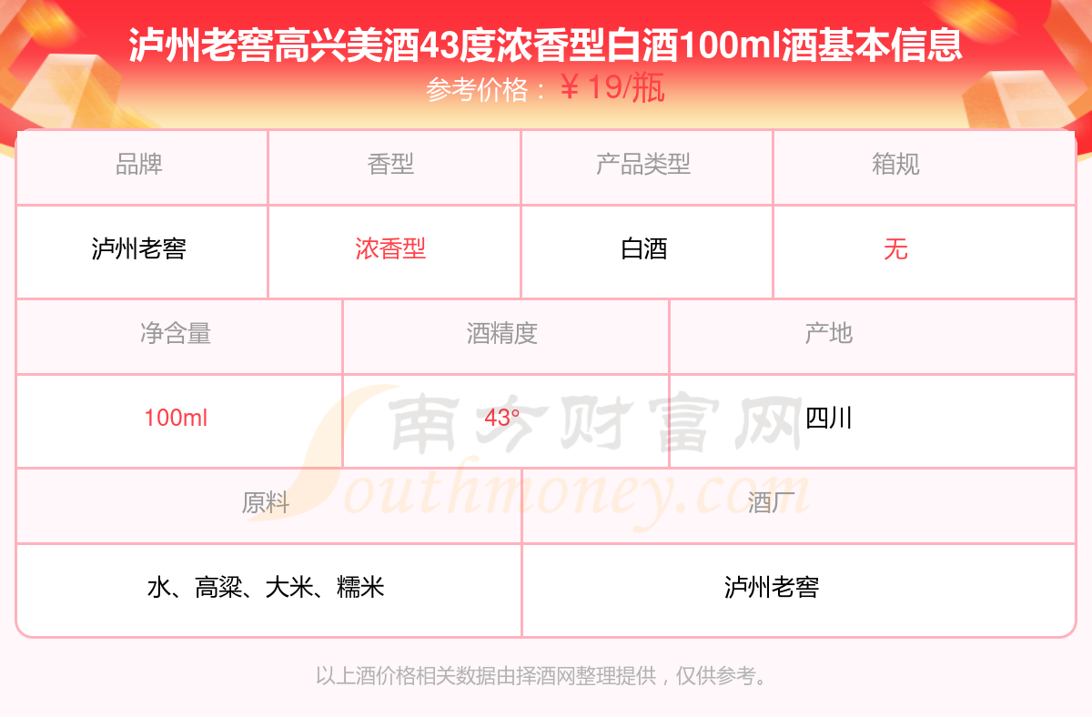 瀘州老窖高興美酒43度濃香型白酒100ml基本信息