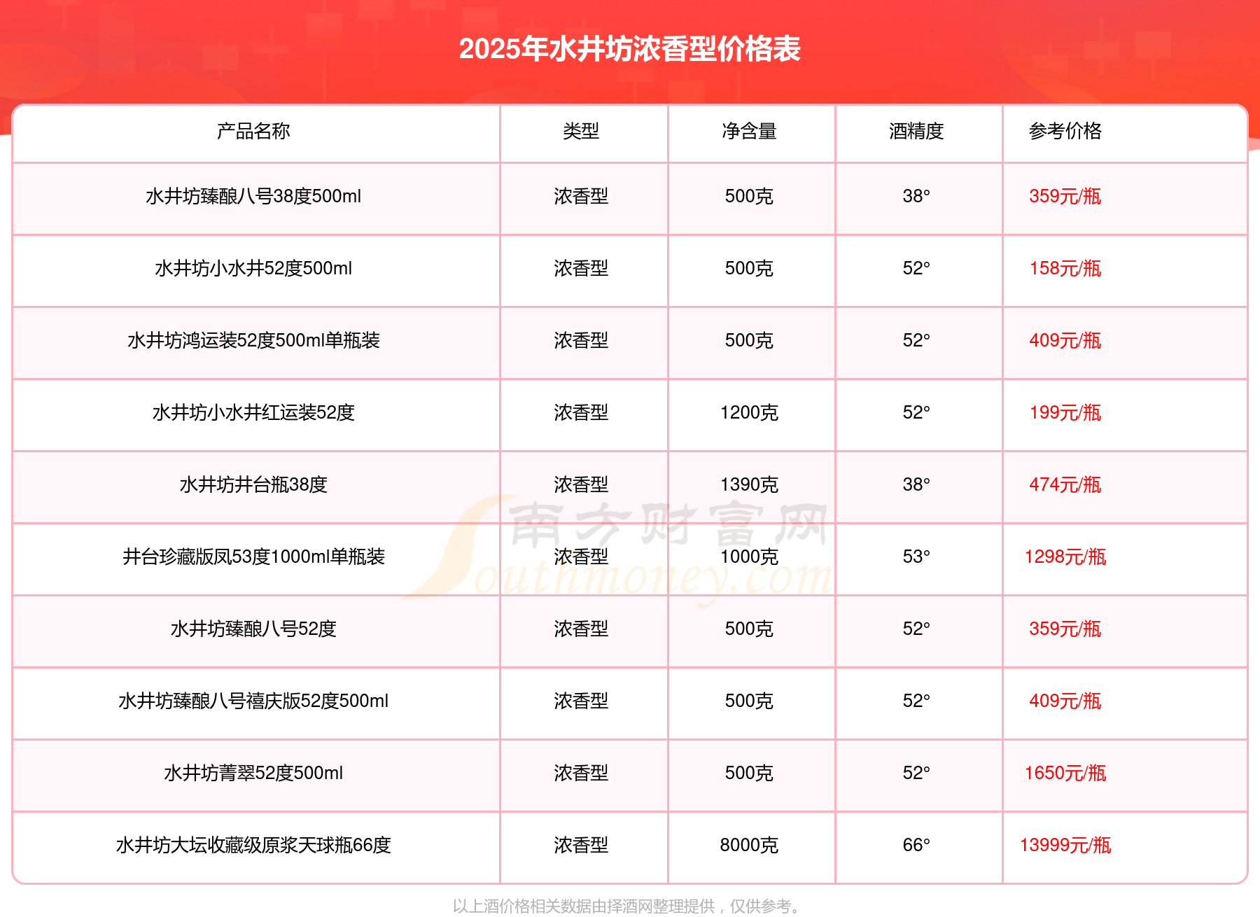 水井坊大壇收藏級(jí)原漿天球瓶66度參考價(jià)13999元/瓶、水井坊博物館壹號(hào)53度雙瓶裝參考價(jià)10988元/瓶、53°水井坊公元十三600ml參考價(jià)2580元/瓶、水井坊梅蘭竹菊52度濃香型600ml4瓶參考價(jià)1999元/瓶、水井坊菁翠52度500ml參考價(jià)1650元/瓶、井臺(tái)珍藏版龍53度1000ml單瓶裝參考價(jià)1298元/瓶。
