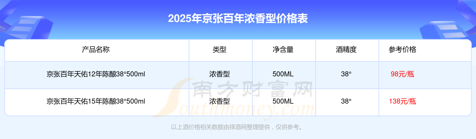 京張百年濃香型酒最新價格2025:京張百年天佑15年陳釀38°500ml參考價138元/瓶、京張百年天佑12年陳釀38°500ml參考價98元/瓶。