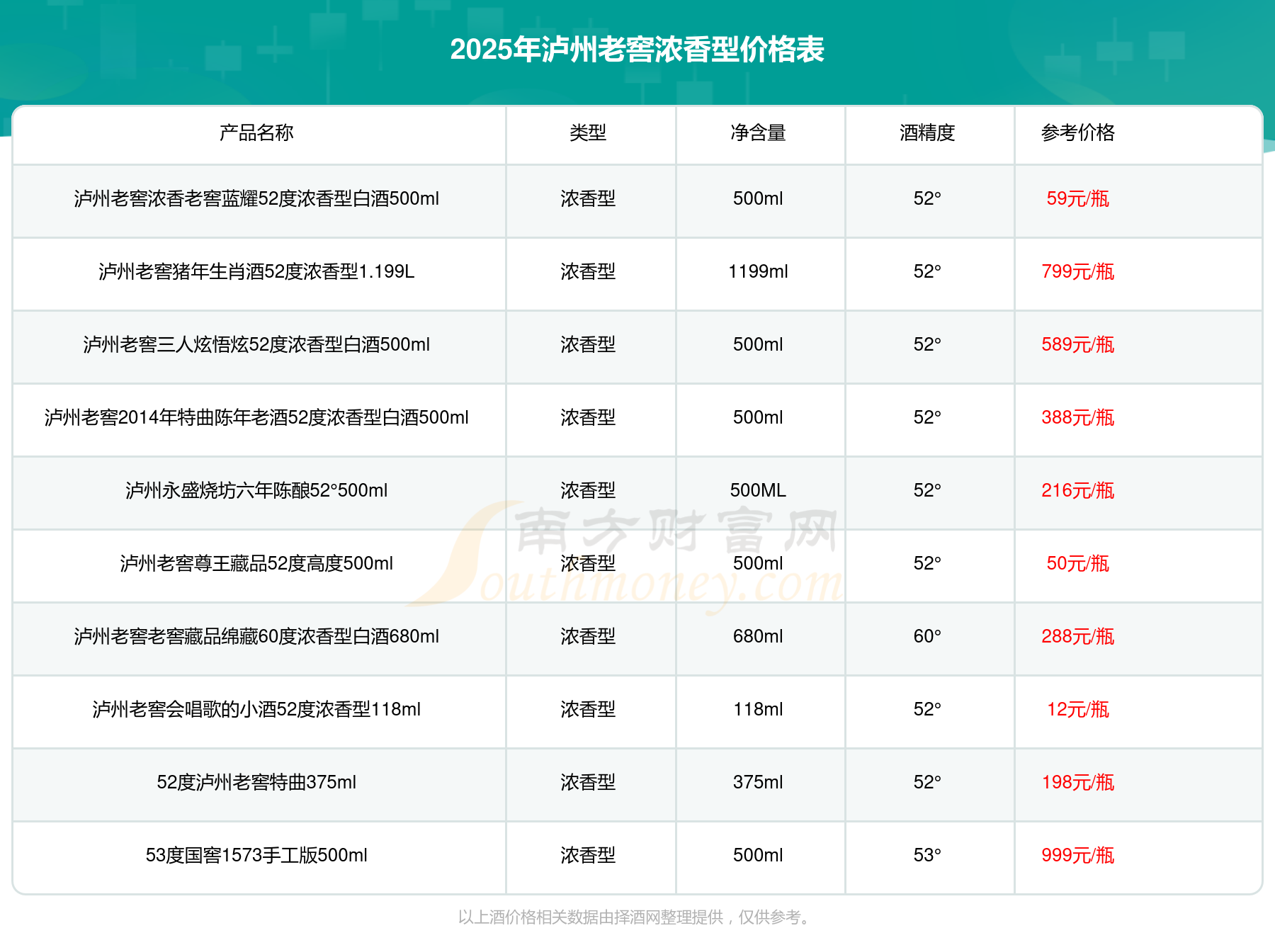 2025年,瀘州老窖國窖1573春釀鼠兆豐年E 55度、瀘州老窖國窖1573生命中的那壇酒55度014、瀘州老窖國窖1573春釀鼠兆豐年A 55度、瀘州老窖國窖1573生命中的那壇酒55度013濃香型白酒1000ml、瀘州老窖國窖1573生命中的那壇酒55度009 1000ml、瀘州老窖國窖1573中國品味52度濃香型白酒500ml、瀘州老窖國窖1573許燎源概念作品58度濃香型白酒1000ml等瀘州老窖濃香型酒參考價格如下:瀘州老窖國窖1573春釀鼠兆豐年E 55度參考價17999元、瀘州老窖國窖1573生命中的那壇酒55度014參考價9999元、瀘州老窖國窖1573春釀鼠兆豐年A 55度參考價5088元、瀘州老窖國窖1573生命中的那壇酒55度013濃香型白酒1000ml參考價4988元、瀘州老窖國窖1573生命中的那壇酒55度009 1000ml參考價4288元、瀘州老窖國窖1573中國品味52度濃香型白酒500ml參考價2888元、瀘州老窖國窖1573許燎源概念作品58度濃香型白酒1000ml參考價2680元。