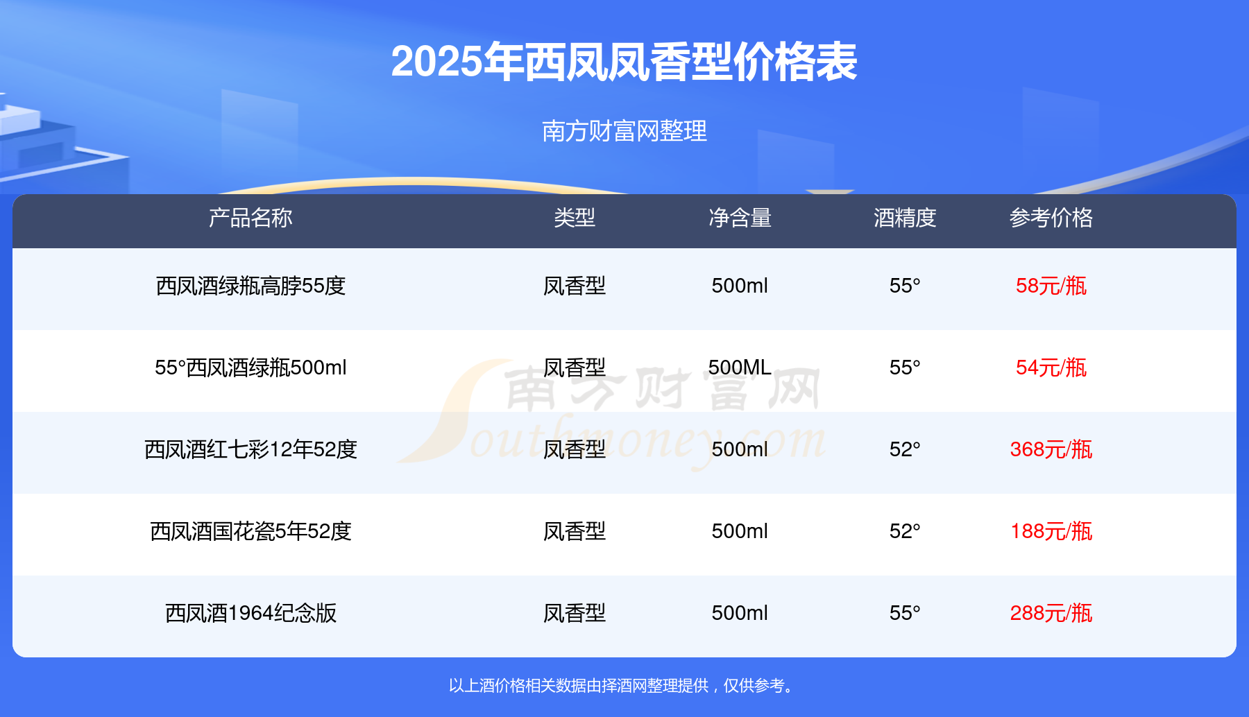 2025年,西鳳酒紅七彩12年52度、西鳳酒1964紀(jì)念版、西鳳酒國花瓷5年52度、西鳳酒綠瓶高脖55度、55°西鳳酒綠瓶500ml等西鳳鳳香型酒價(jià)格如下: