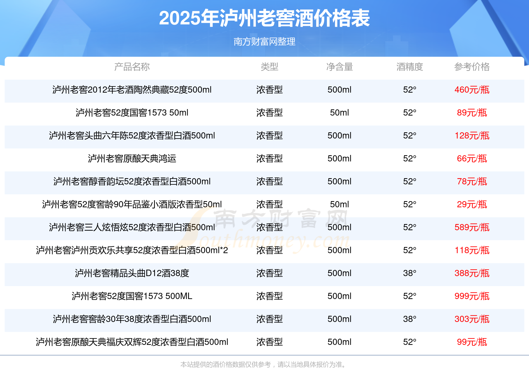 2025瀘州老窖酒最新價(jià)格:瀘州老窖國窖1573春釀鼠兆豐年E 55度參考價(jià)17999元/瓶、瀘州老窖國窖1573生命中的那壇酒55度014參考價(jià)9999元/瓶、瀘州老窖國窖1573春釀鼠兆豐年A 55度參考價(jià)5088元/瓶、瀘州老窖國窖1573生命中的那壇酒55度013濃香型白酒1000ml參考價(jià)4988元/瓶、瀘州老窖國窖1573生命中的那壇酒55度009 1000ml參考價(jià)4288元/瓶、瀘州老窖國窖1573中國品味52度濃香型白酒500ml參考價(jià)2888元/瓶。