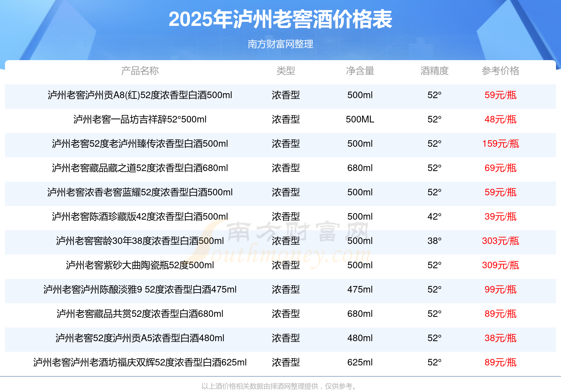 2025年瀘州老窖價格最高的酒是瀘州老窖國窖1573春釀鼠兆豐年E 55度,參考價17999元/瓶,最低的是瀘州老窖45度五洲醉8窖經典小酒版濃香型100ml,參考價10元/瓶,價格高低差為17989元/瓶。