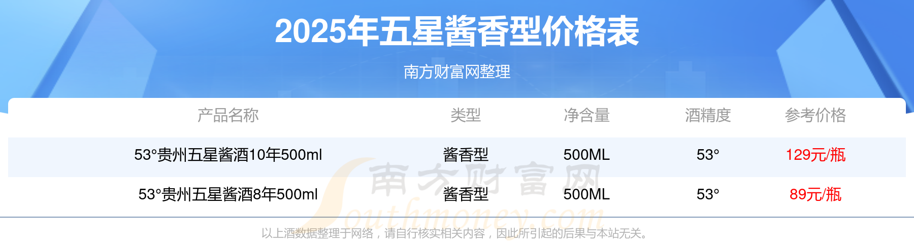 53°貴州五星醬酒10年500ml參考價(jià)129元/瓶、53°貴州五星醬酒8年500ml參考價(jià)89元/瓶。