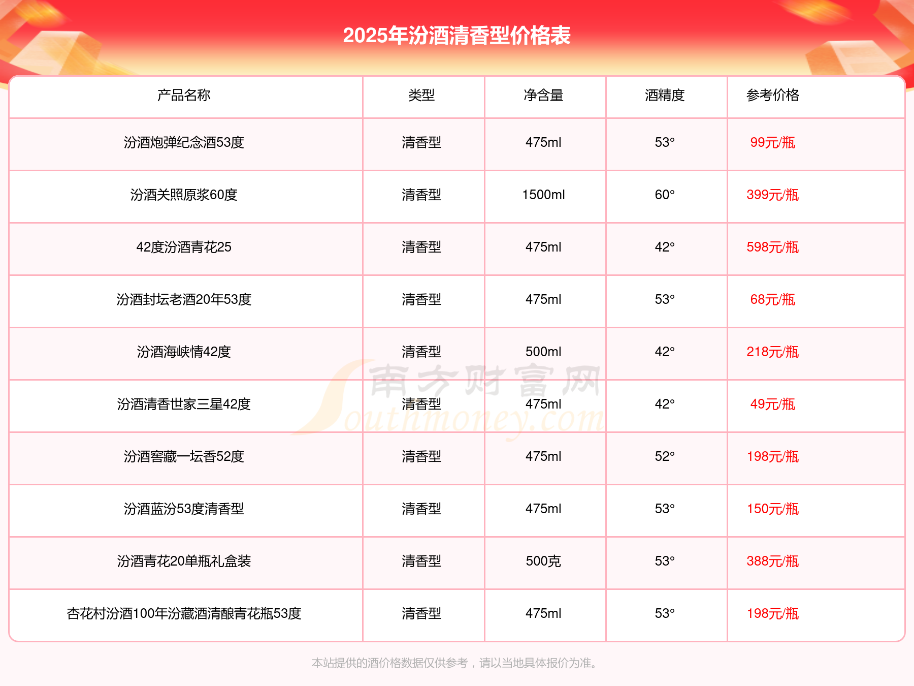2025年,汾酒清香型酒價格最高的是汾酒原漿一壇香60°3000ml,參考價2180元,最低的是汾酒百年汾杏酒純釀53度,參考價28元,價格高低差為2152元。