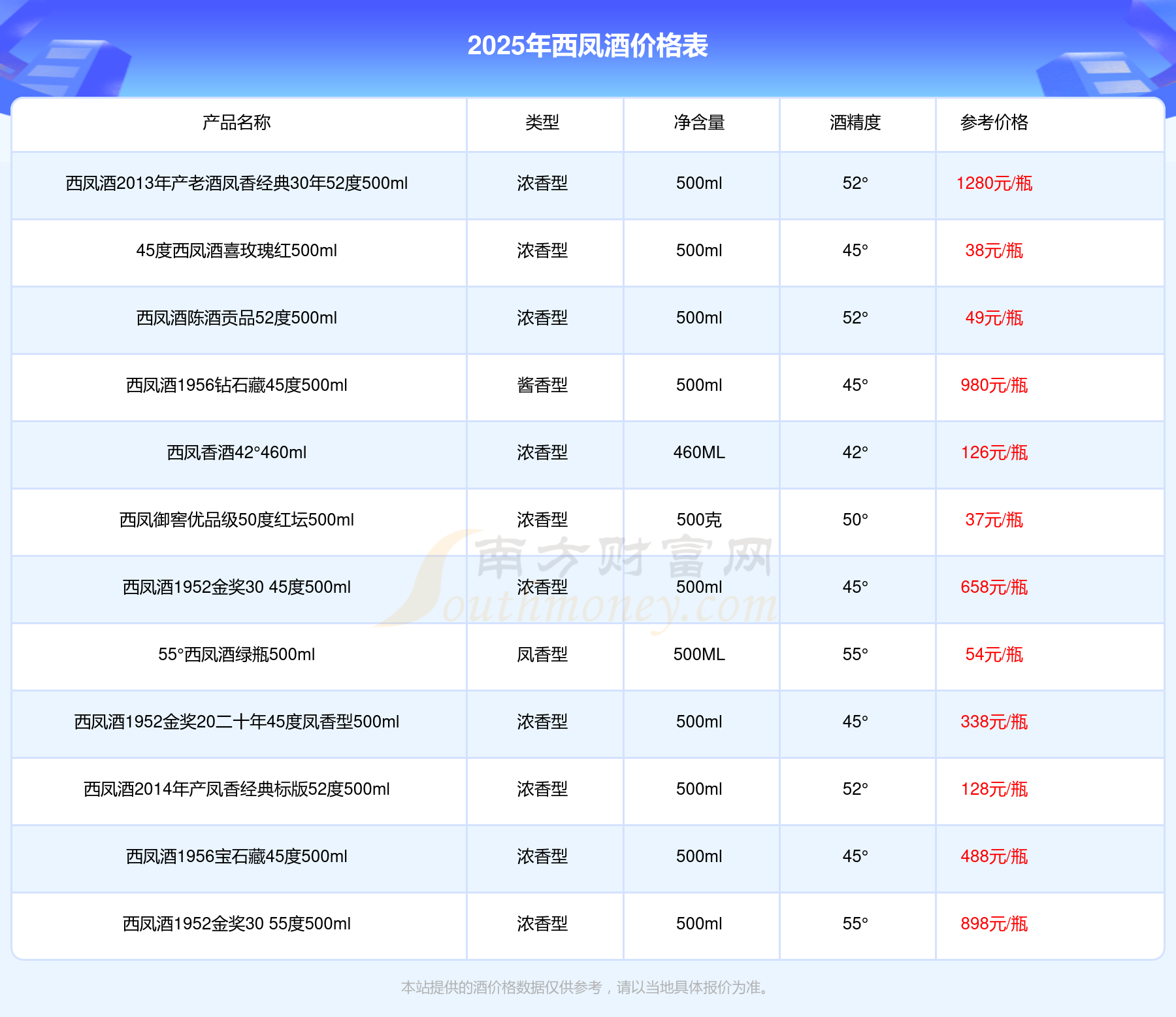 2025年,西鳳酒 酒海私藏55度3000ml、西鳳酒1952金獎(jiǎng)50 55度500ml、西鳳酒2013年產(chǎn)老酒鳳香經(jīng)典30年52度500ml、西鳳酒1956鉆石藏45度500ml、西鳳酒1952金獎(jiǎng)30 55度500ml、西鳳酒鳳香經(jīng)典20年52度500ml、西鳳酒1952金獎(jiǎng)30 45度500ml等西鳳酒價(jià)格如下:西鳳酒 酒海私藏55度3000ml參考價(jià)8880元/瓶、西鳳酒1952金獎(jiǎng)50 55度500ml參考價(jià)2380元/瓶、西鳳酒2013年產(chǎn)老酒鳳香經(jīng)典30年52度500ml參考價(jià)1280元/瓶、西鳳酒1956鉆石藏45度500ml參考價(jià)980元/瓶、西鳳酒1952金獎(jiǎng)30 55度500ml參考價(jià)898元/瓶、西鳳酒鳳香經(jīng)典20年52度500ml參考價(jià)768元/瓶、西鳳酒1952金獎(jiǎng)30 45度500ml參考價(jià)658元/瓶。