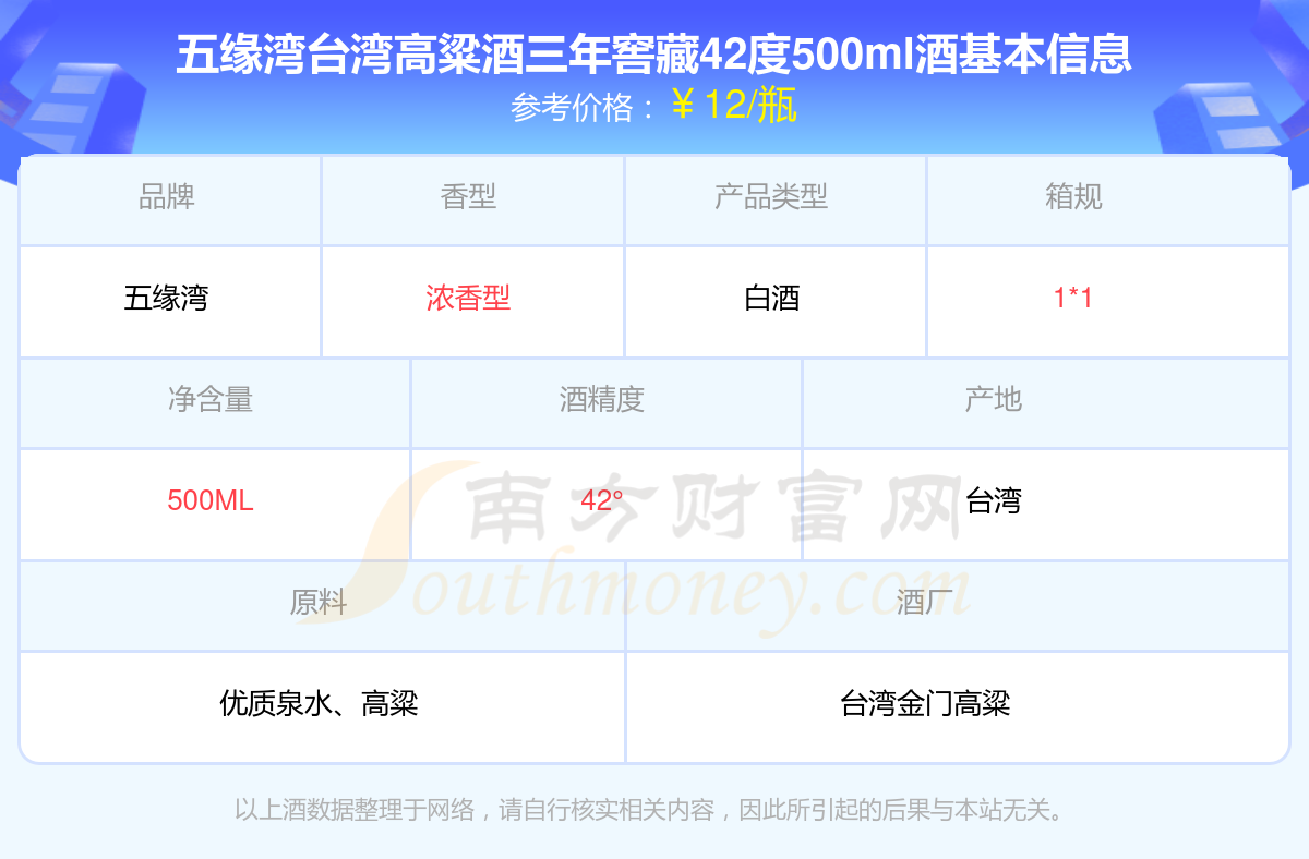 五緣灣臺(tái)灣高粱酒三年窖藏42度500ml基本信息