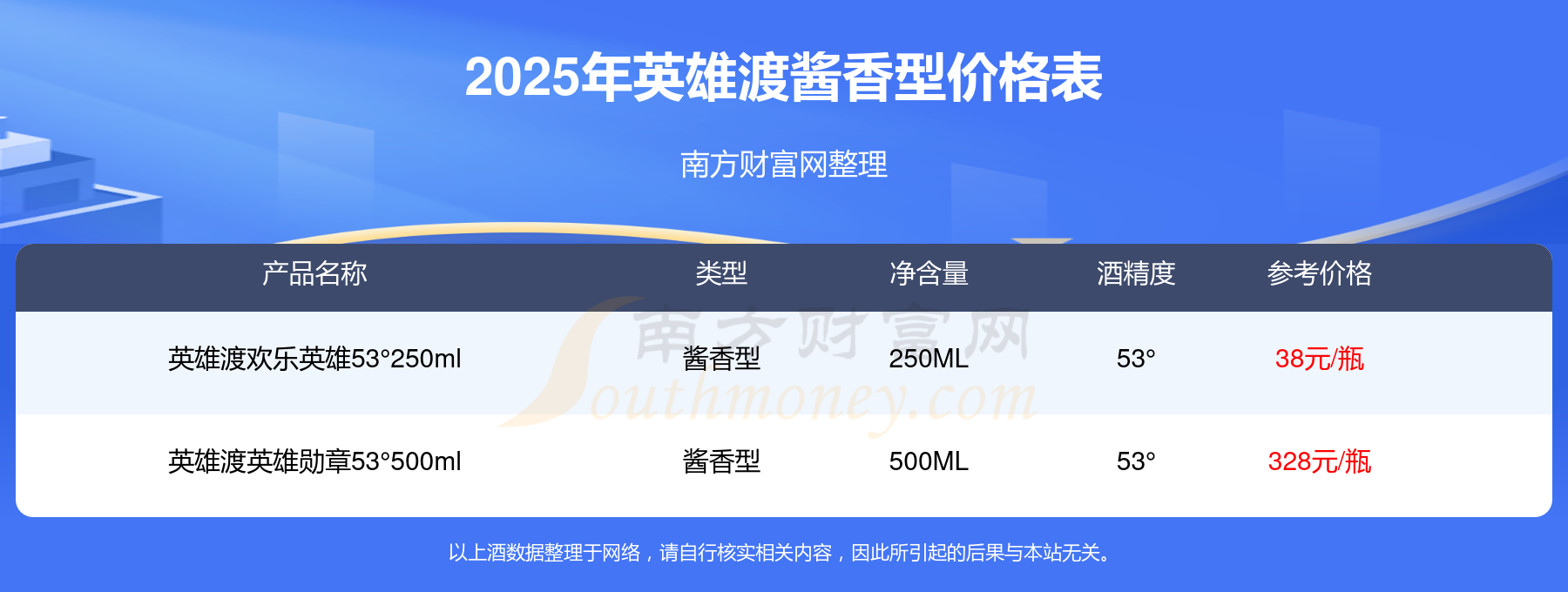 英雄渡醬香型酒最新價格2025:英雄渡英雄勛章53°500ml參考價328元/瓶、英雄渡歡樂英雄53°250ml參考價38元/瓶。