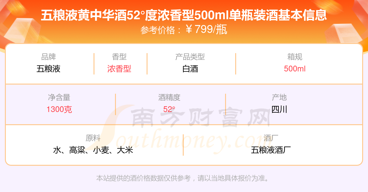 五糧液黃中華酒52°度濃香型500ml單瓶裝基本信息