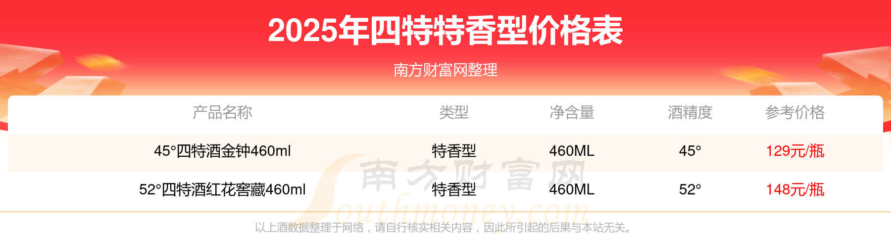 2025年,四特特香型酒價(jià)格最高的是52°四特酒紅花窖藏460ml,參考價(jià)148元,最低的是45°四特酒金鐘460ml,參考價(jià)129元,價(jià)格高低差為19元。