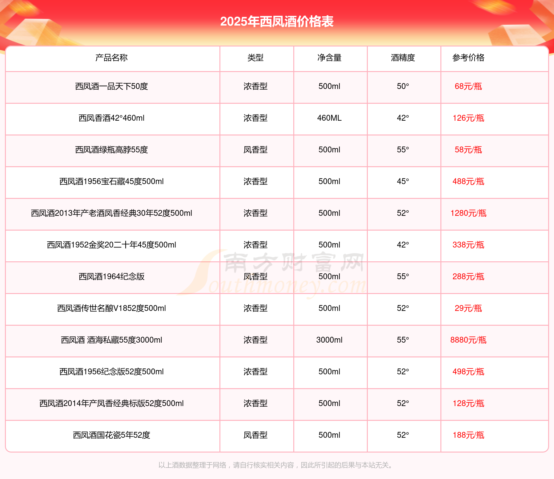 2025年,西鳳酒 酒海私藏55度3000ml、西鳳酒1952金獎50 55度500ml、西鳳酒2013年產(chǎn)老酒鳳香經(jīng)典30年52度500ml、西鳳酒1956鉆石藏45度500ml、西鳳酒1952金獎30 55度500ml等西鳳酒價格如下: