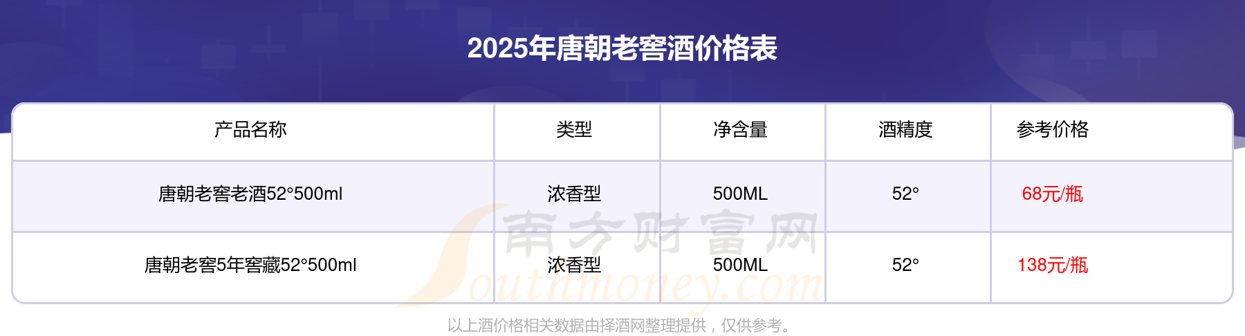 唐朝老窖5年窖藏52°500ml參考價138元/瓶、唐朝老窖老酒52°500ml參考價68元/瓶。