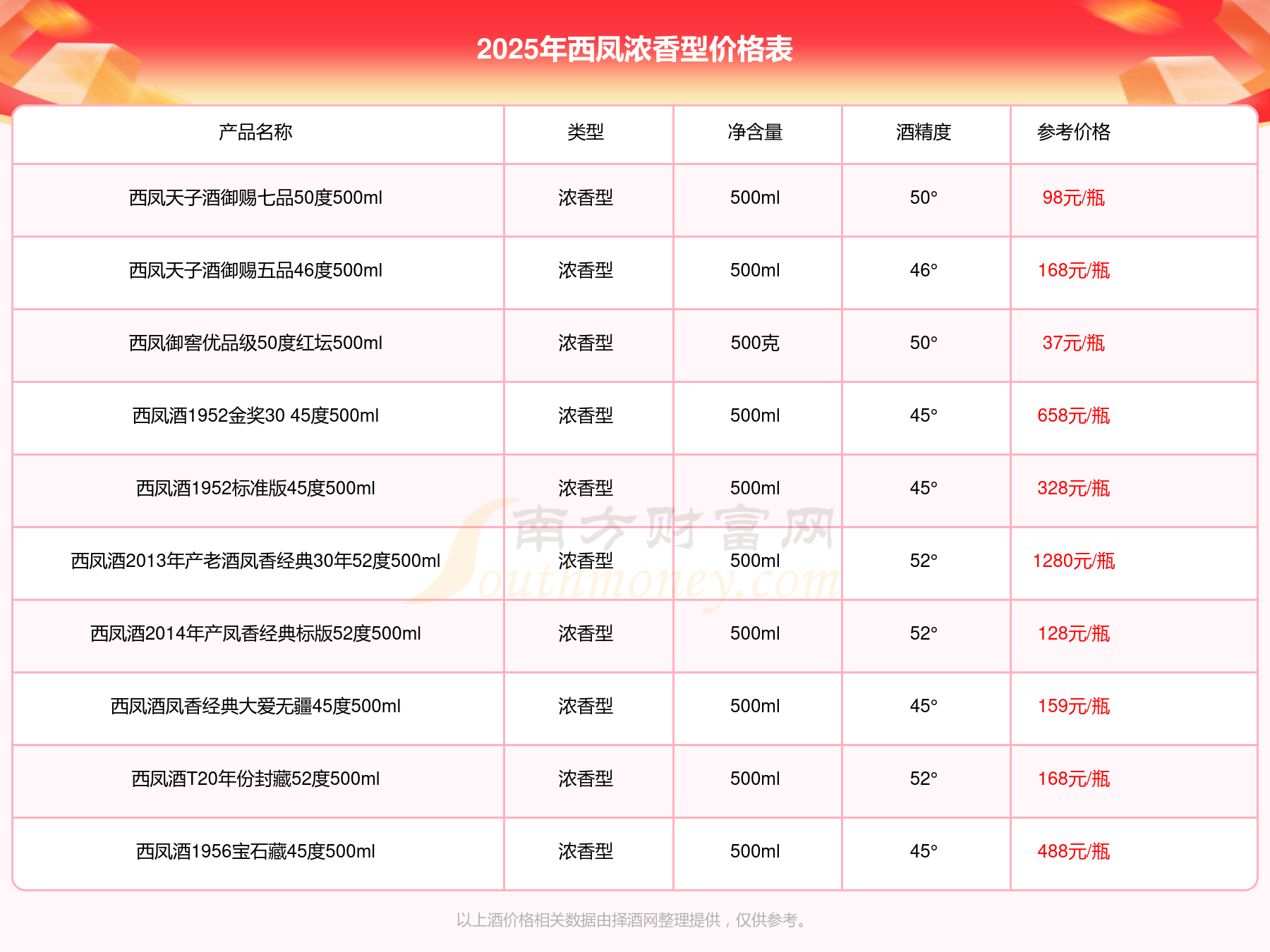西鳳酒 酒海私藏55度3000ml參考價8880元/瓶、西鳳酒1952金獎50 55度500ml參考價2380元/瓶、西鳳酒2013年產(chǎn)老酒鳳香經(jīng)典30年52度500ml參考價1280元/瓶、西鳳酒1952金獎30 55度500ml參考價898元/瓶、西鳳酒鳳香經(jīng)典20年52度500ml參考價768元/瓶、西鳳酒1952金獎30 45度500ml參考價658元/瓶、西鳳酒1956紀念版52度500ml參考價498元/瓶。