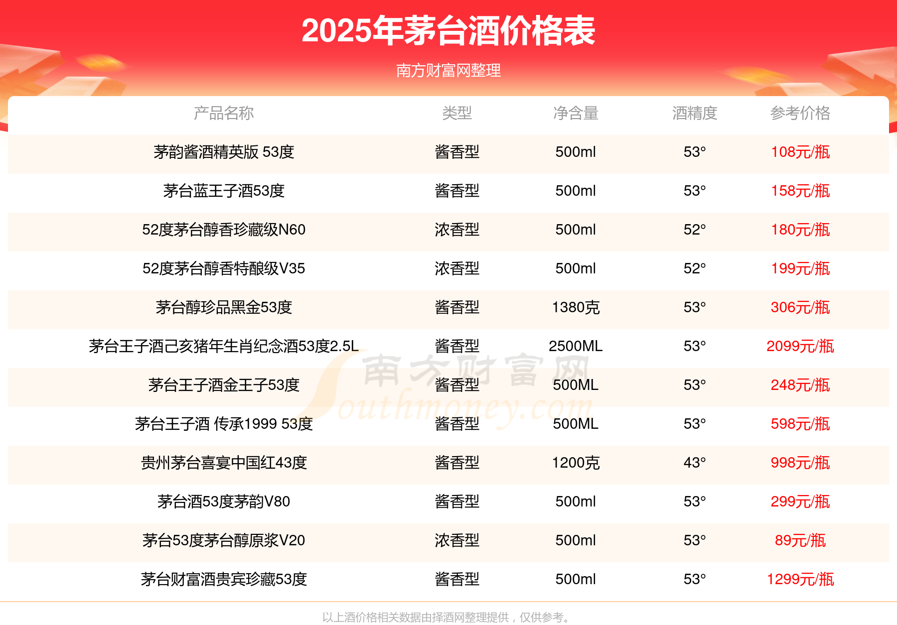 2025年茅臺酒華茅鑒藏 醬香型白酒 3L 53°、53度五星茅臺生肖酒丁酉雞年、貴州茅臺己亥豬年生肖酒53°500ml、53度五星茅臺生肖酒戊戌狗年等最新價格如下:華茅鑒藏 醬香型白酒 3L 53°參考價8388元/瓶、53度五星茅臺生肖酒丁酉雞年參考價2798元/瓶、貴州茅臺己亥豬年生肖酒53°500ml參考價2699元/瓶、53度五星茅臺生肖酒戊戌狗年參考價2698元/瓶。