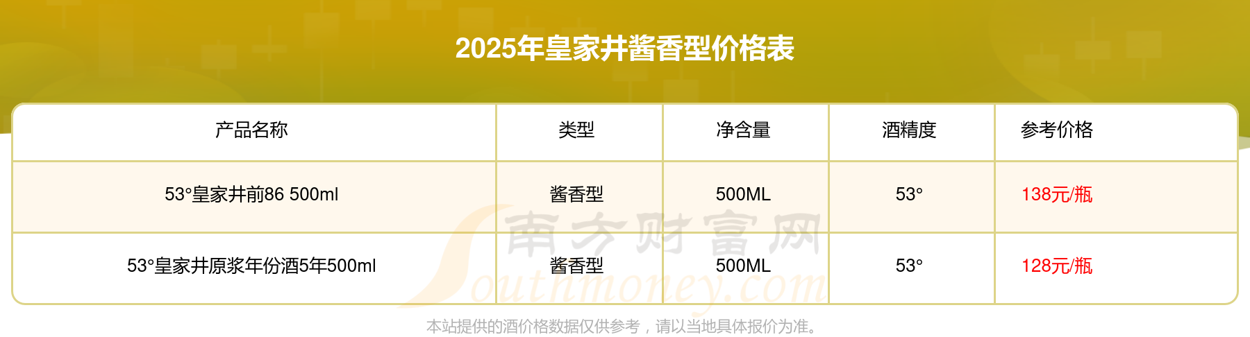 2025年皇家井醬香型酒53°皇家井前86 500ml、53°皇家井原漿年份酒5年500ml等最新價(jià)格如下: