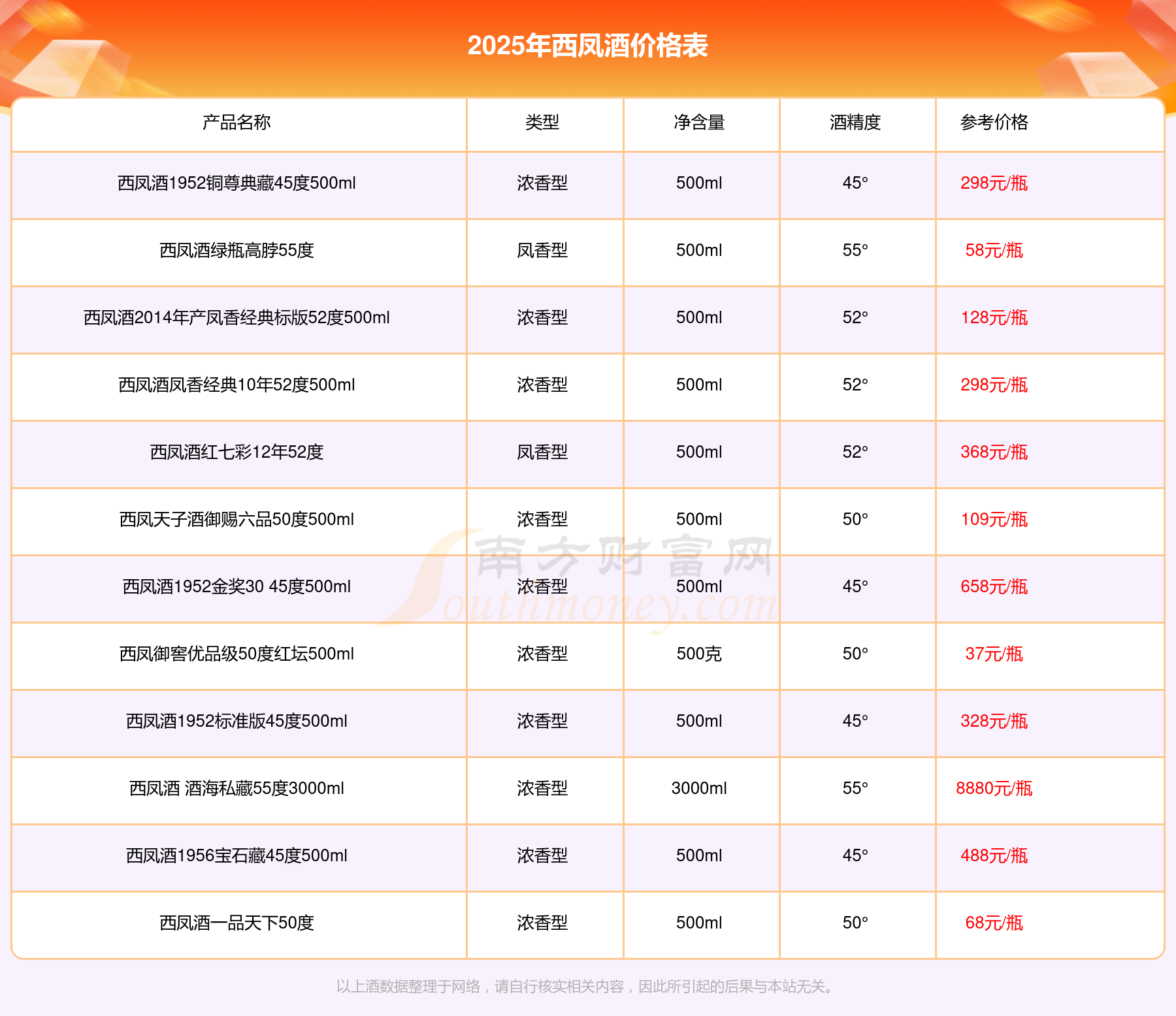 2025年,西鳳酒 酒海私藏55度3000ml、西鳳酒1952金獎50 55度500ml、西鳳酒2013年產(chǎn)老酒鳳香經(jīng)典30年52度500ml等西鳳酒價格如下:西鳳酒 酒海私藏55度3000ml參考價8880元/瓶、西鳳酒1952金獎50 55度500ml參考價2380元/瓶、西鳳酒2013年產(chǎn)老酒鳳香經(jīng)典30年52度500ml參考價1280元/瓶。