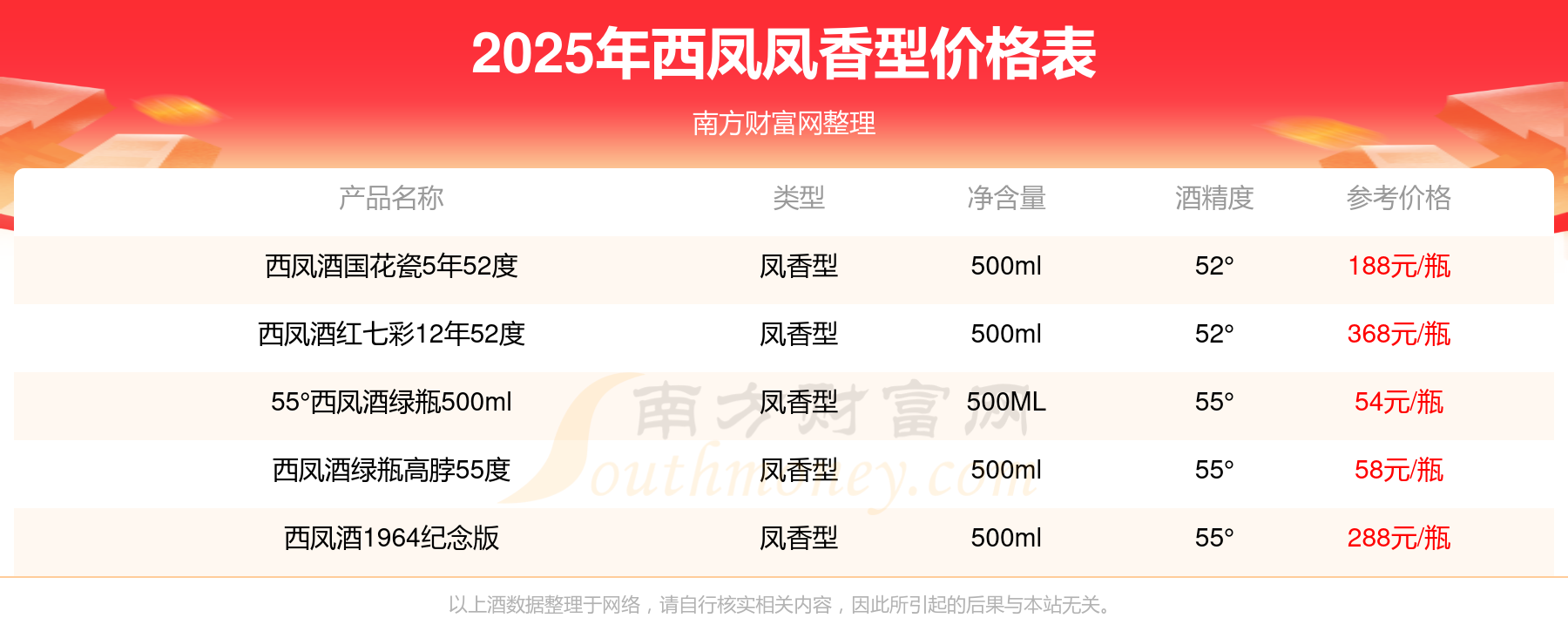 2025年,西鳳酒紅七彩12年52度、西鳳酒1964紀(jì)念版、西鳳酒國(guó)花瓷5年52度、西鳳酒綠瓶高脖55度、55°西鳳酒綠瓶500ml等西鳳鳳香型酒價(jià)格如下:西鳳酒紅七彩12年52度參考價(jià)368元/瓶、西鳳酒1964紀(jì)念版參考價(jià)288元/瓶、西鳳酒國(guó)花瓷5年52度參考價(jià)188元/瓶、西鳳酒綠瓶高脖55度參考價(jià)58元/瓶、55°西鳳酒綠瓶500ml參考價(jià)54元/瓶。
