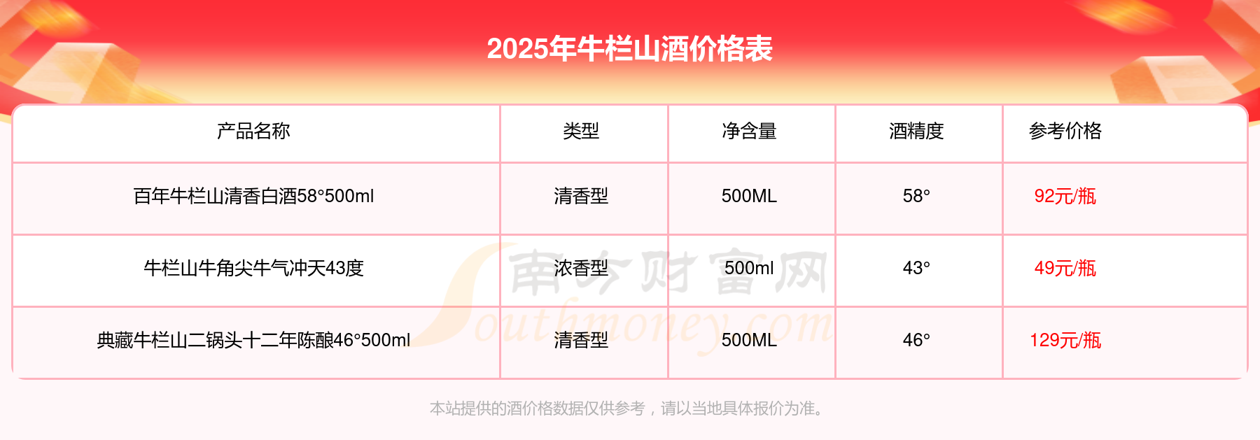 2025年牛欄山酒典藏牛欄山二鍋頭十二年陳釀46°500ml、百年牛欄山清香白酒58°500ml、牛欄山牛角尖牛氣沖天43度等最新價(jià)格如下: