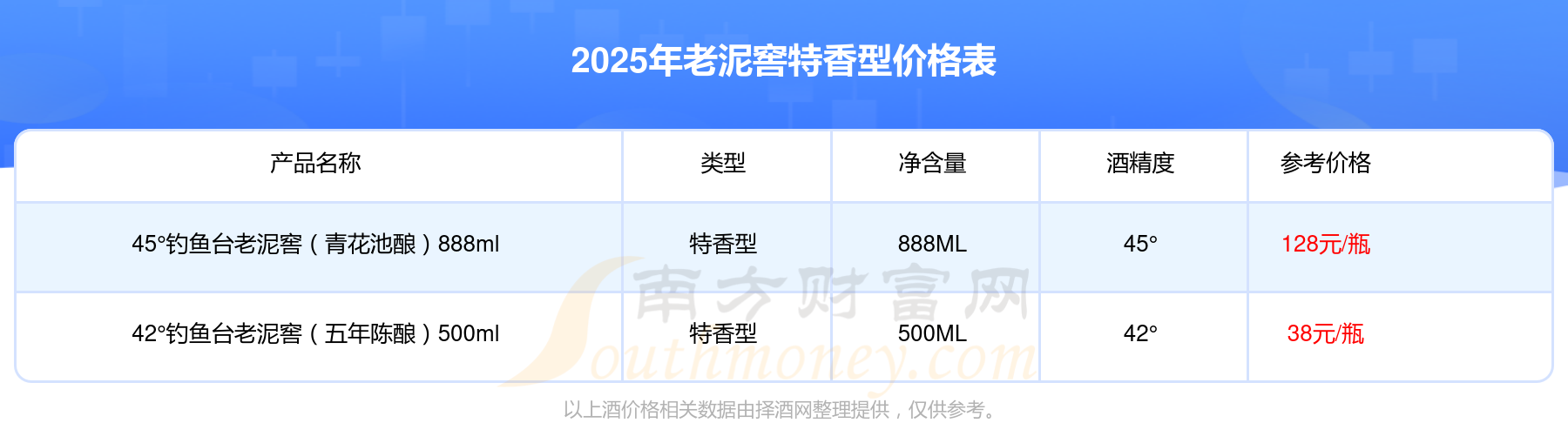2025年老泥窖特香型酒45°釣魚臺(tái)老泥窖(青花池釀)888ml、42°釣魚臺(tái)老泥窖(五年陳釀)500ml等最新價(jià)格如下:45°釣魚臺(tái)老泥窖(青花池釀)888ml參考價(jià)128元/瓶、42°釣魚臺(tái)老泥窖(五年陳釀)500ml參考價(jià)38元/瓶。