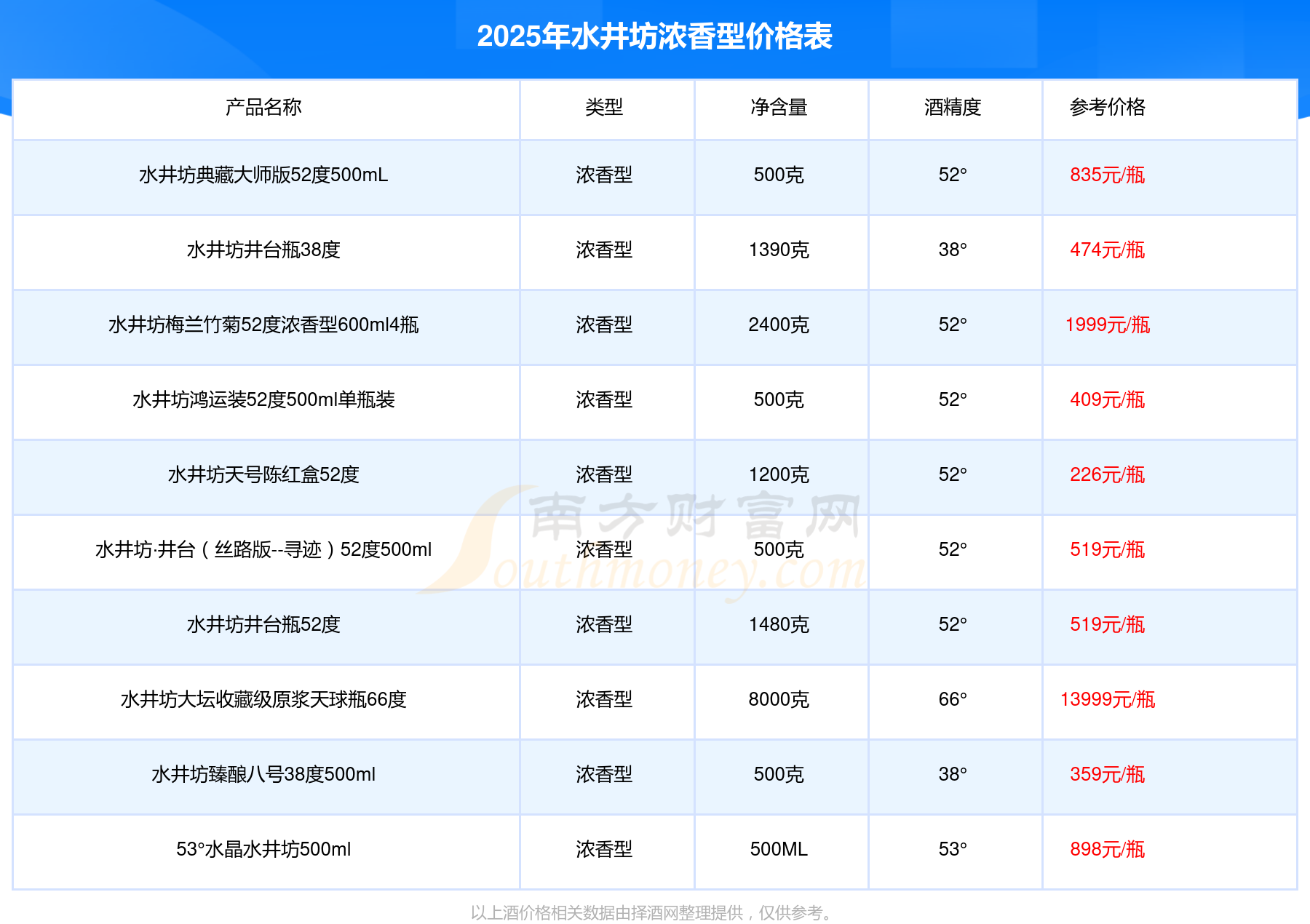2025年,水井坊濃香型酒價(jià)格最高的是水井坊大壇收藏級(jí)原漿天球瓶66度,參考價(jià)13999元,最低的是水井坊小水井52度500ml,參考價(jià)158元,價(jià)格高低差為13841元。