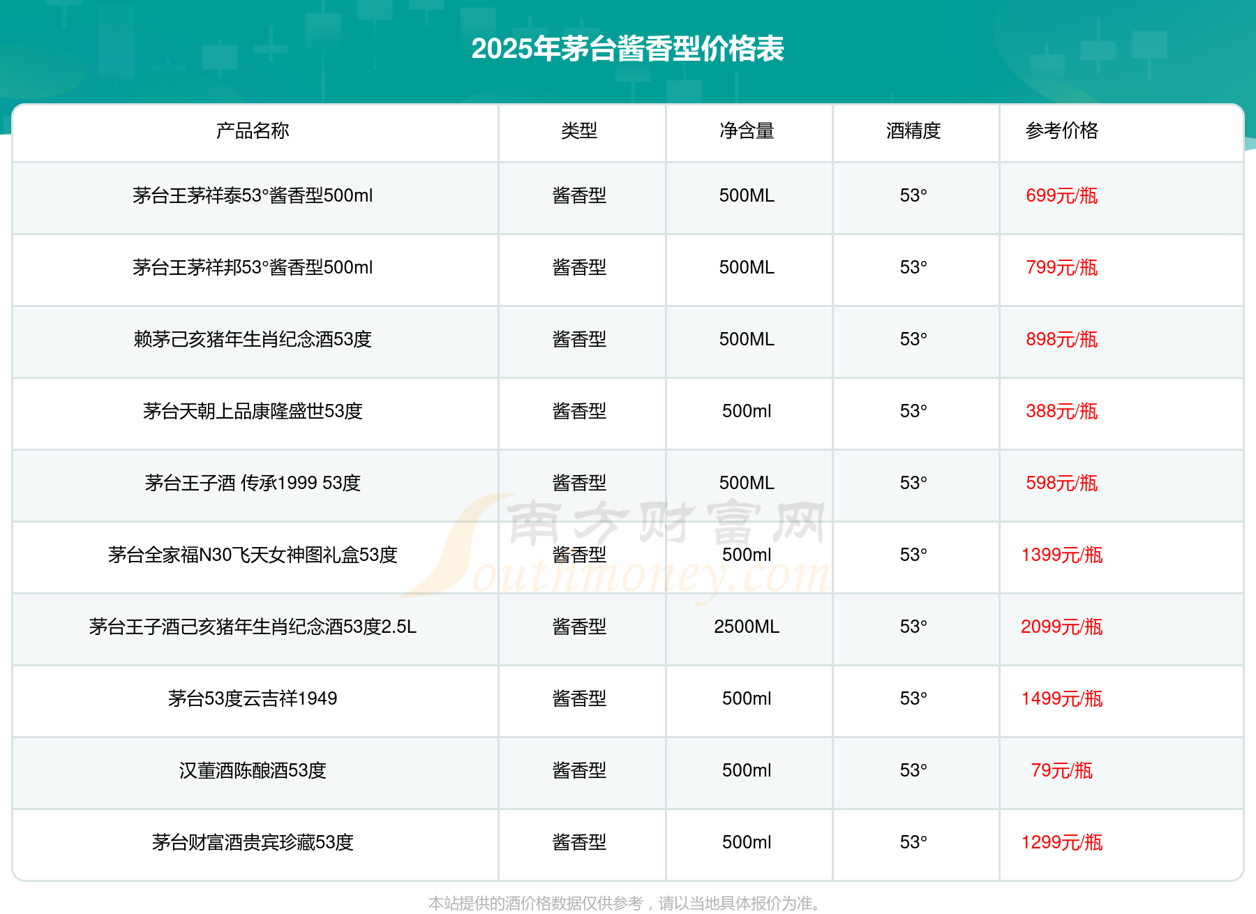 華茅鑒藏 醬香型白酒 3L 53°參考價8388元/瓶、53度五星茅臺生肖酒丁酉雞年參考價2798元/瓶、貴州茅臺己亥豬年生肖酒53°500ml參考價2699元/瓶、53度五星茅臺生肖酒戊戌狗年參考價2698元/瓶、飛天茅臺53°500ml(2015年)參考價2199元/瓶。
