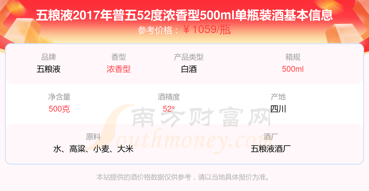五糧液2017年普五52度濃香型500ml單瓶裝基本信息