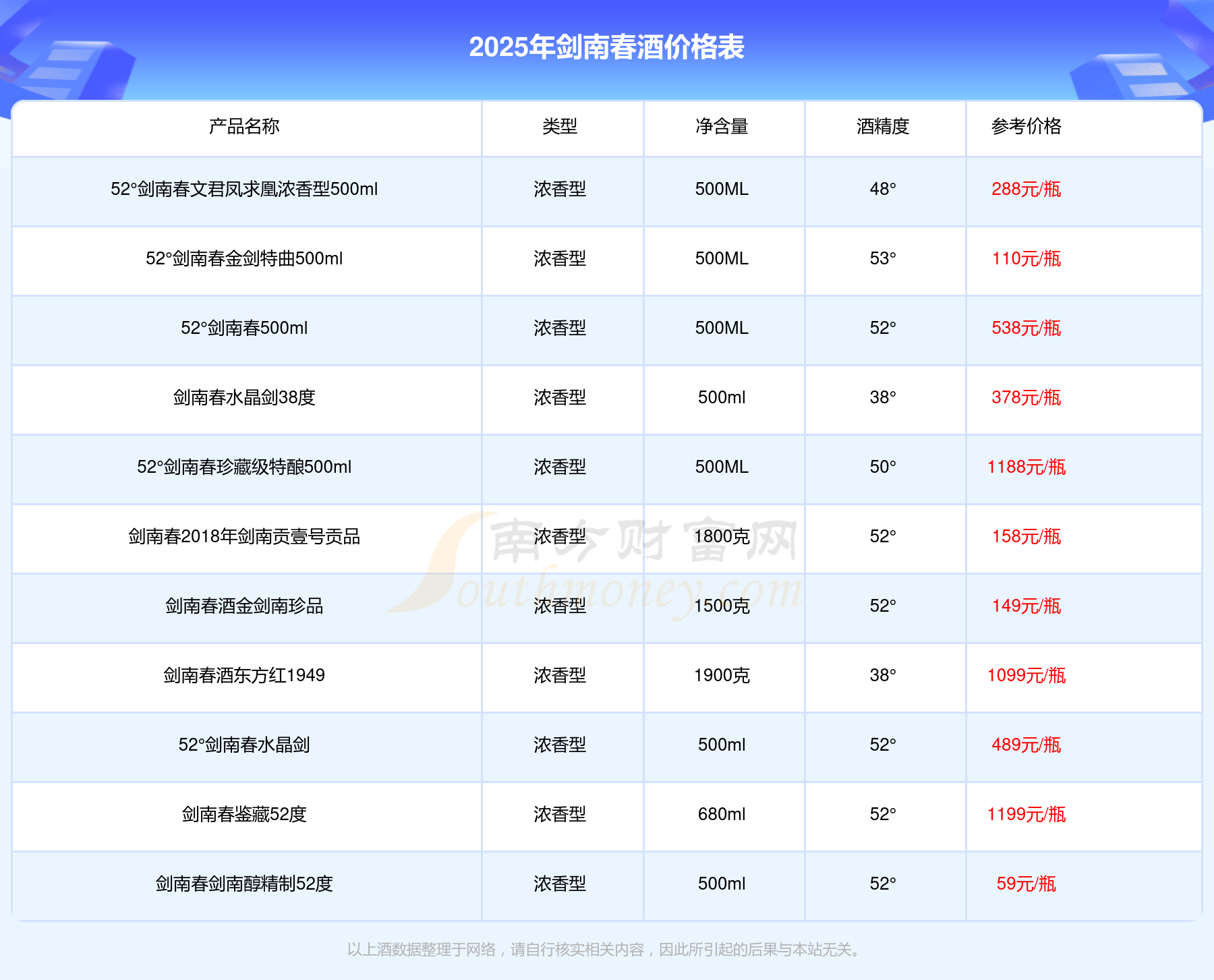 2025年劍南春酒劍南春鑒藏52度、52°劍南春珍藏級特釀500ml、劍南春酒東方紅1949、52°劍南春500ml等最新價格如下:劍南春鑒藏52度參考價1199元/瓶、52°劍南春珍藏級特釀500ml參考價1188元/瓶、劍南春酒東方紅1949參考價1099元/瓶、52°劍南春500ml參考價538元/瓶。