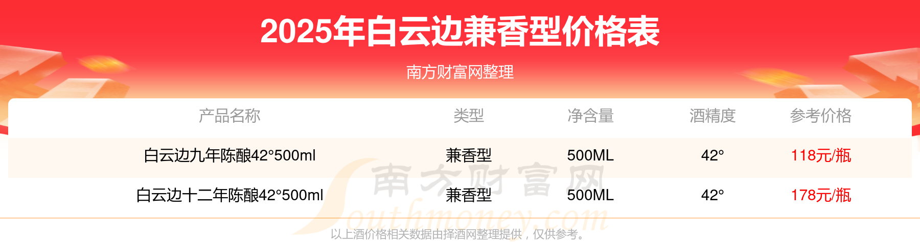 2025年白云邊兼香型酒白云邊十二年陳釀42°500ml、白云邊九年陳釀42°500ml等最新價(jià)格如下:白云邊十二年陳釀42°500ml參考價(jià)178元/瓶、白云邊九年陳釀42°500ml參考價(jià)118元/瓶。