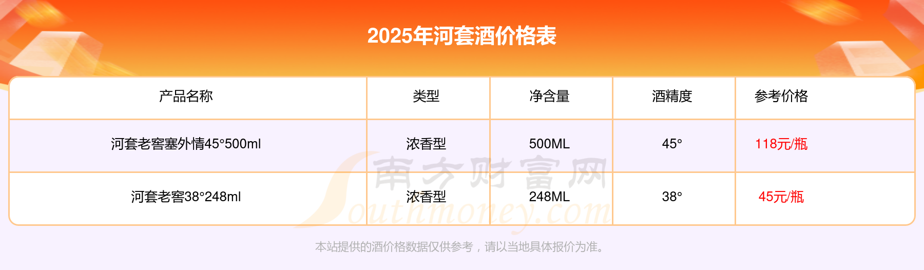 2025年,河套老窖塞外情45°500ml、河套老窖38°248ml等河套酒價(jià)格如下:河套老窖塞外情45°500ml參考價(jià)118元/瓶、河套老窖38°248ml參考價(jià)45元/瓶。