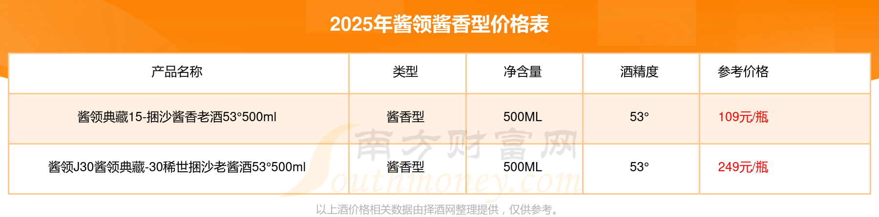 醬領醬香型酒最新價格2025:醬領J30醬領典藏-30稀世捆沙老醬酒53°500ml參考價249元/瓶、醬領典藏15-捆沙醬香老酒53°500ml參考價109元/瓶。