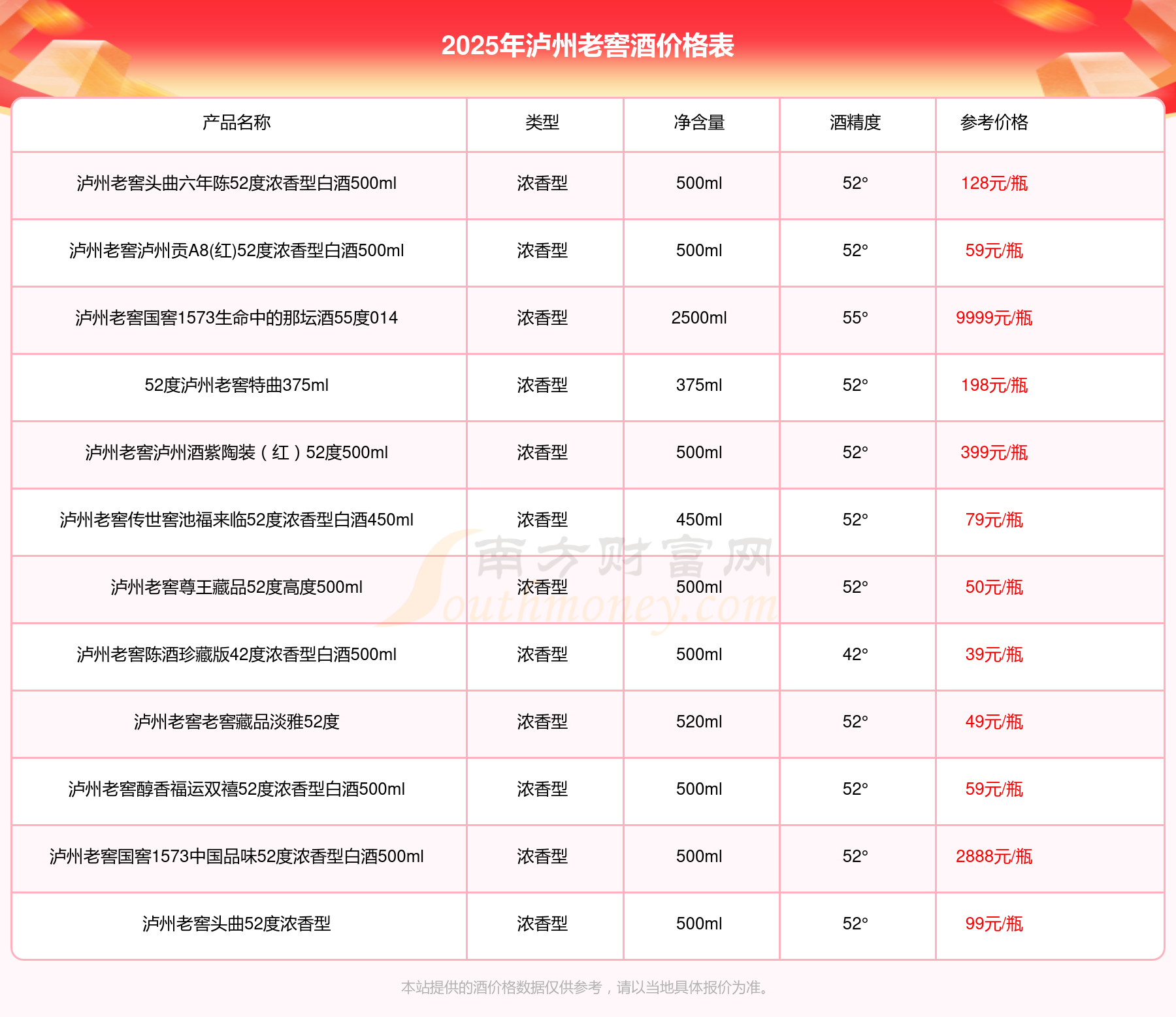 瀘州老窖國窖1573春釀鼠兆豐年E 55度參考價(jià)17999元/瓶、瀘州老窖國窖1573生命中的那壇酒55度014參考價(jià)9999元/瓶、瀘州老窖國窖1573春釀鼠兆豐年A 55度參考價(jià)5088元/瓶、瀘州老窖國窖1573生命中的那壇酒55度013濃香型白酒1000ml參考價(jià)4988元/瓶、瀘州老窖國窖1573生命中的那壇酒55度009 1000ml參考價(jià)4288元/瓶、瀘州老窖國窖1573中國品味52度濃香型白酒500ml參考價(jià)2888元/瓶。