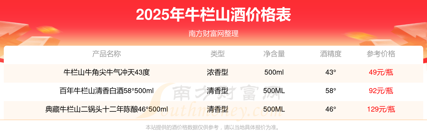 2025年,典藏牛欄山二鍋頭十二年陳釀46°500ml、百年牛欄山清香白酒58°500ml、牛欄山牛角尖牛氣沖天43度等牛欄山酒價(jià)格如下:典藏牛欄山二鍋頭十二年陳釀46°500ml參考價(jià)129元/瓶、百年牛欄山清香白酒58°500ml參考價(jià)92元/瓶、牛欄山牛角尖牛氣沖天43度參考價(jià)49元/瓶。