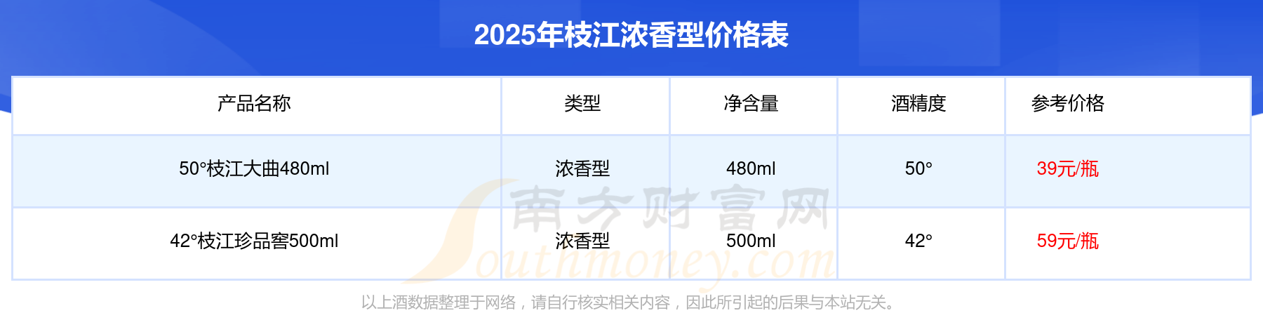 2025年,枝江濃香型酒價(jià)格最高的是42°枝江珍品窖500ml,參考價(jià)59元,最低的是50°枝江大曲480ml,參考價(jià)39元,價(jià)格高低差為20元。