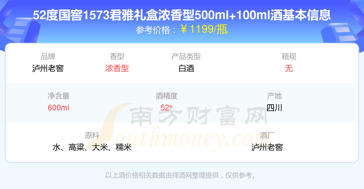 52度國(guó)窖1573君雅禮盒濃香型500ml+100ml基本信息