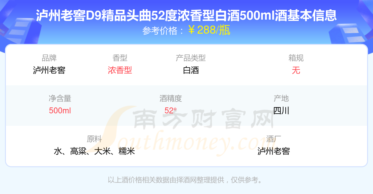 瀘州老窖D9精品頭曲52度濃香型白酒500ml基本信息