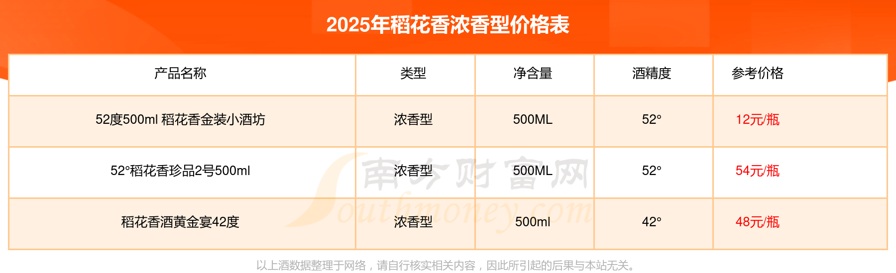 52°稻花香珍品2號500ml參考價54元/瓶、稻花香酒黃金宴42度參考價48元/瓶、52度500ml 稻花香金裝小酒坊參考價12元/瓶。