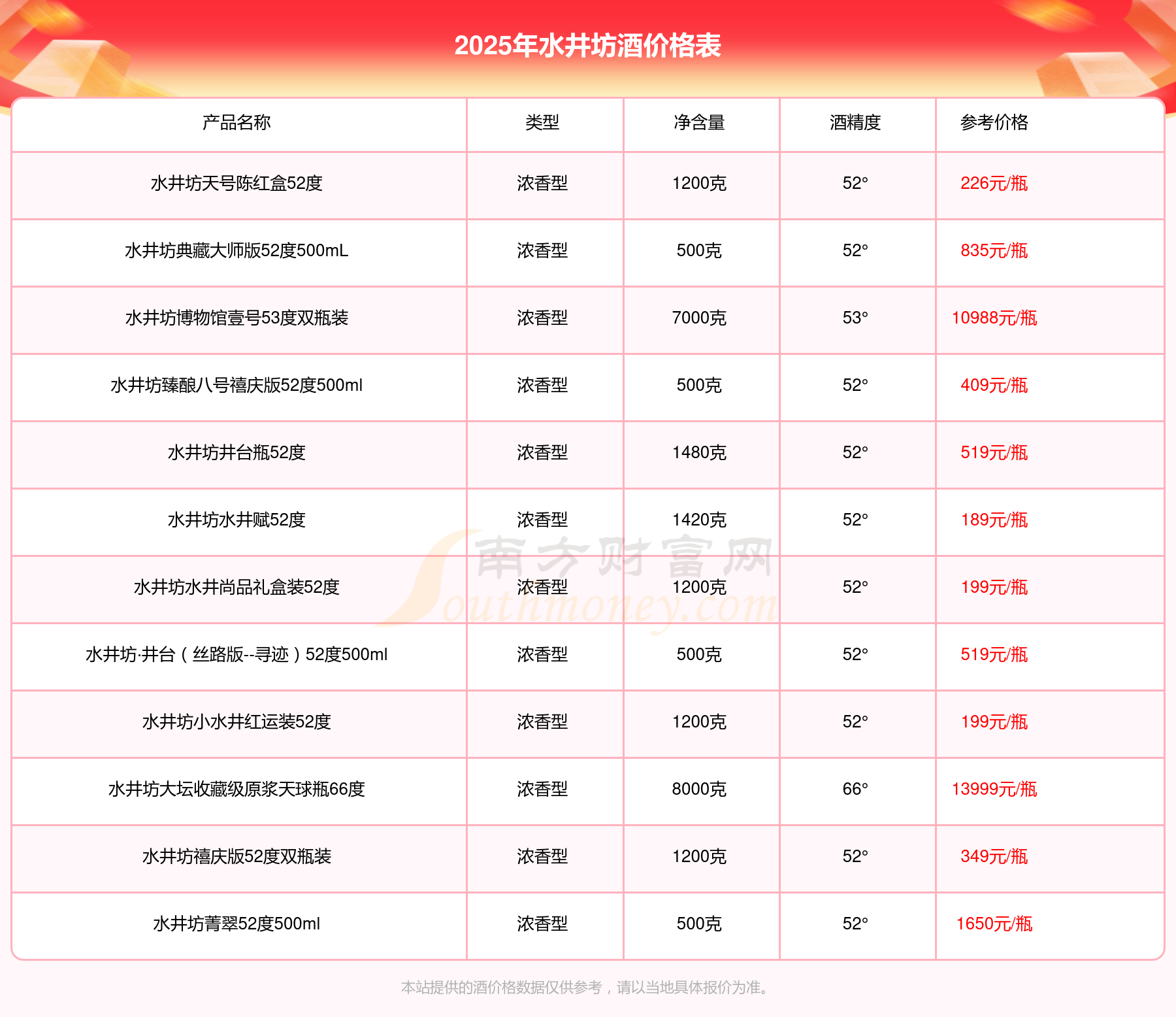 水井坊大壇收藏級原漿天球瓶66度參考價13999元/瓶、水井坊博物館壹號53度雙瓶裝參考價10988元/瓶、53°水井坊公元十三600ml參考價2580元/瓶、水井坊梅蘭竹菊52度濃香型600ml4瓶參考價1999元/瓶。